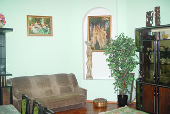 the second floor of a two storied building. Bedroom supplied with middle size double bed, sofa in the living-room. Bathroom is bath / toilet. Kitchen is supplied with refrigerator,plates and dishes, oven. Equipped with phone, TV-set, nice antique furniture, hot and cold water. More photos The price: 70 USD for one day Book