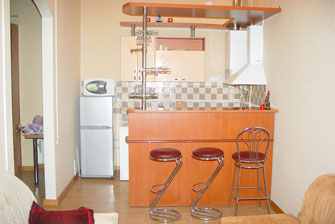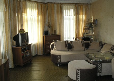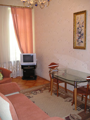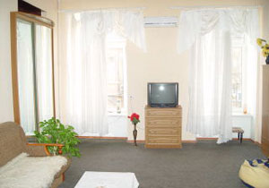 the third floor of a three storied building. Bedroom is supplied with a double bed. Bathroom is bath / toilet. Kitchen-studio has all necessary things for cooking. Living-room has double hidden sofa. Equipped with refrigerator, phone for city calls, dvd player, TV-set(cable TV), computer with Internet connection,plates and dishes, coffee maker, nice furniture, iron, washing-machine, hot and cold water, own water heating, air-conditioner, coffee machine,oven, microwave. More photos The price: 60 USD for one day Book